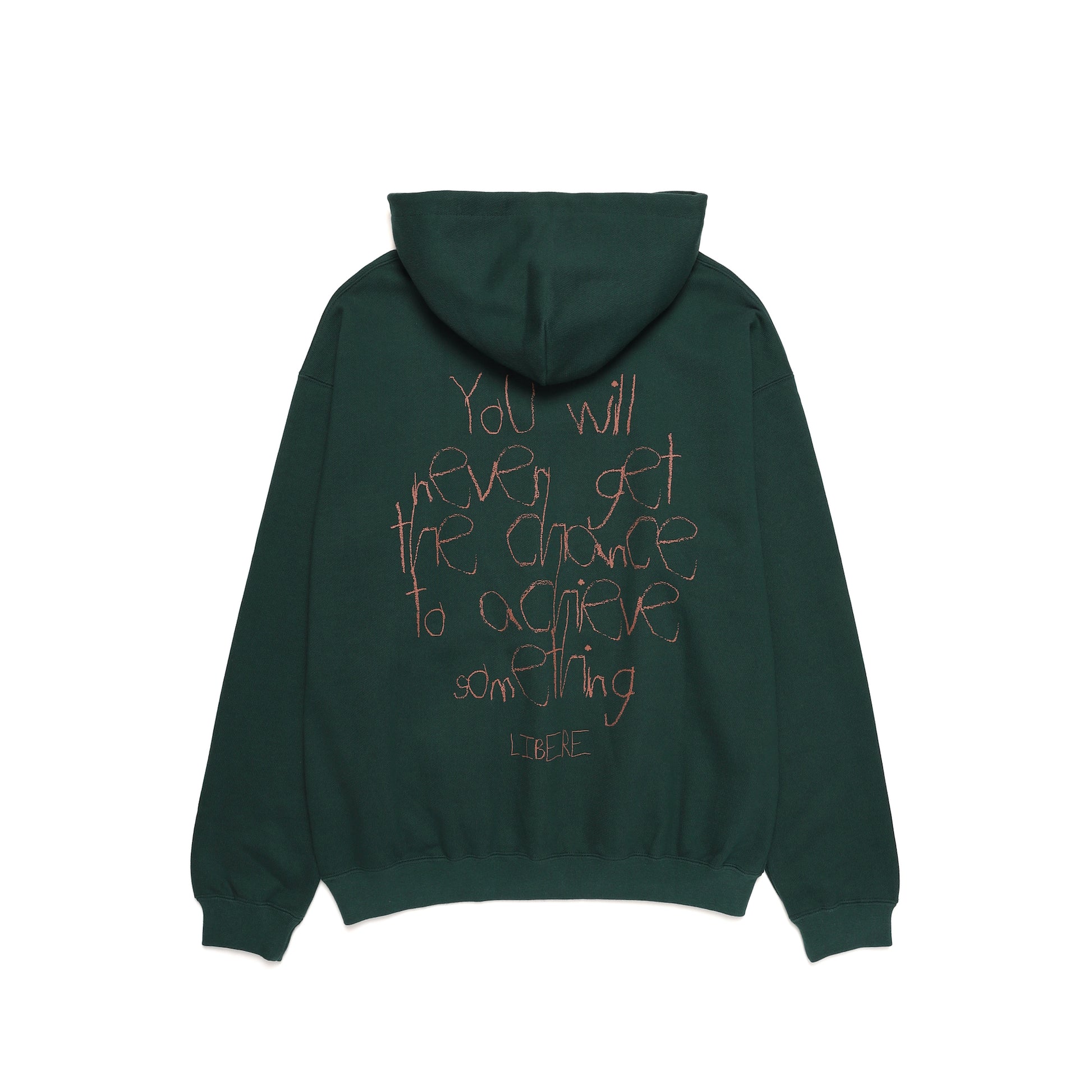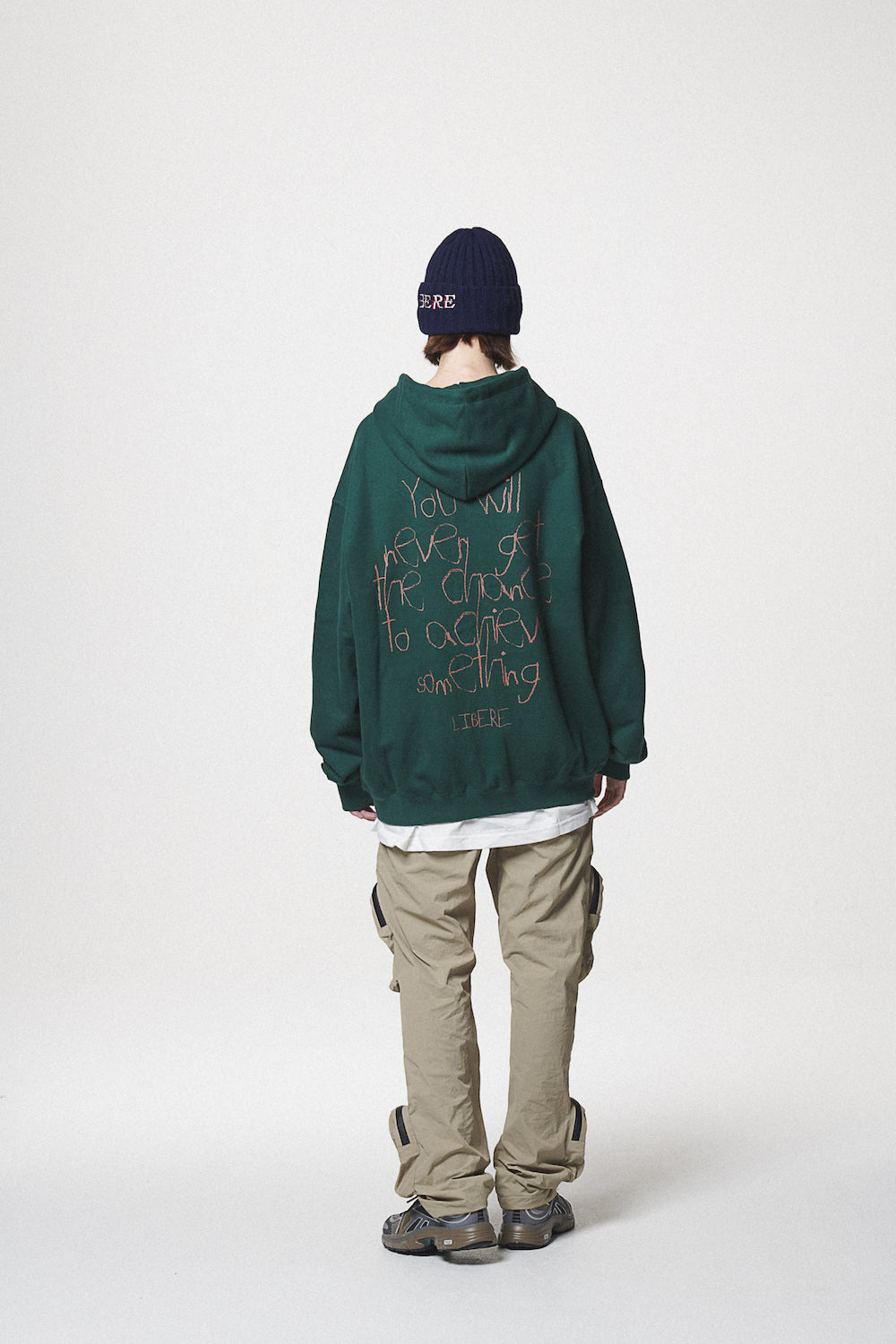 バックに子どもの手書き風メッセージをプリントしたフーディー。